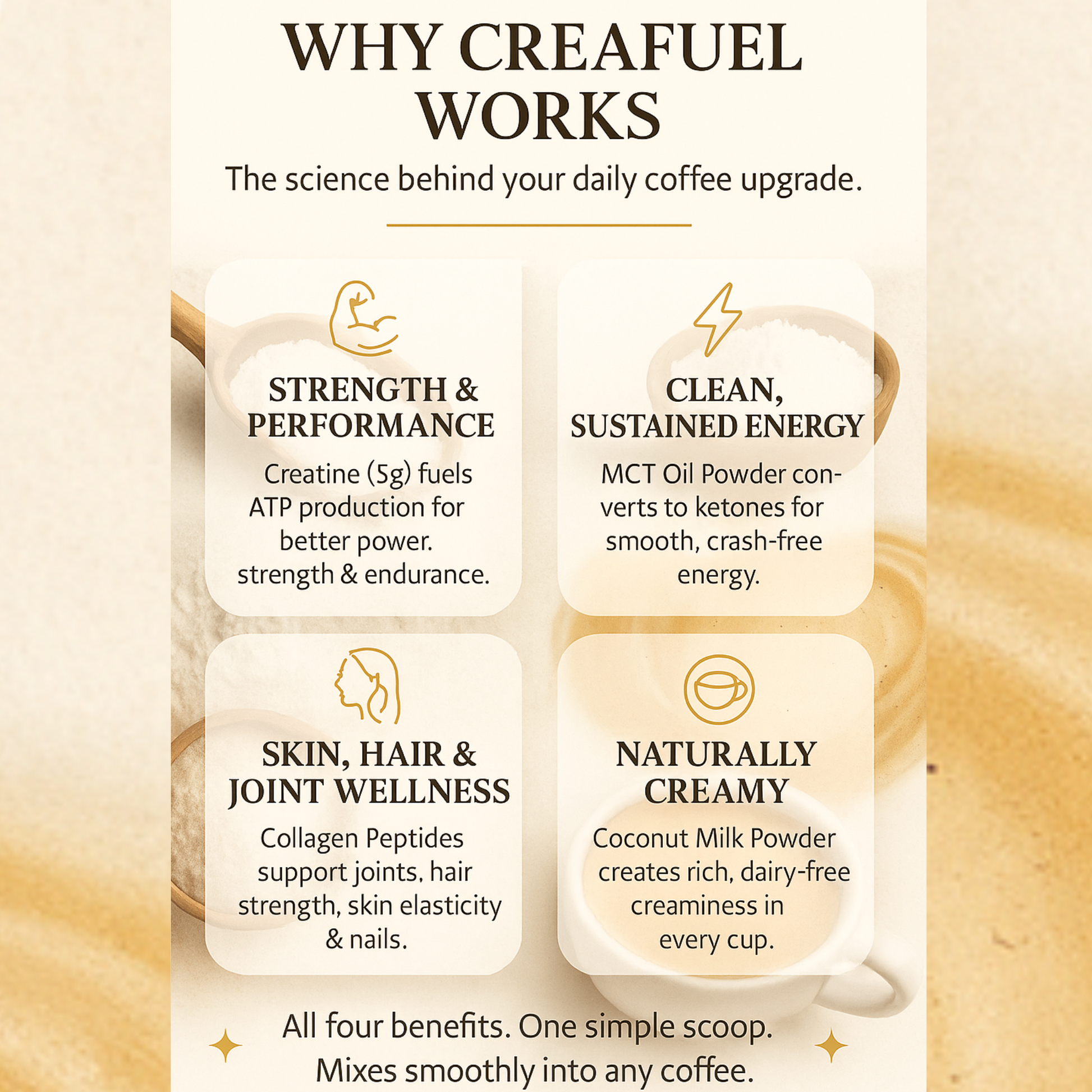 This is not just a creamer—CreaFuel is your new morning ritual. Designed to support brainpower, performance, and wellness without added sugar.